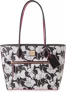 Created exclusively for Disney Theme Parks and Resorts Allover Dumbo print ** Each piece is unique and pattern elements may vary ** Screen art on simulated leather ** Stitched leather finishings with pink edging ** Zip closure ** Exterior zip pocket ** Interior zip pocket Two interior slip pockets ** Cell phone pocket ** Interior key hook ** Goldtone hardware ** Fully lined ** Removable leather tag with embossed LoungefIyDisney Dumbo" type ** “Dooney & Bourke Since 1975" embossed leather label inside "Dooney & Bourke" embossed metal label on front ** Inspired by WaIt Disney's Dumbo (1941) ** 80% PVC / 20% coated cotton with leather trim and metal hardware 10 1/4" H x 11 3/4" W x 5 1/2" D ** Handle length: 10"